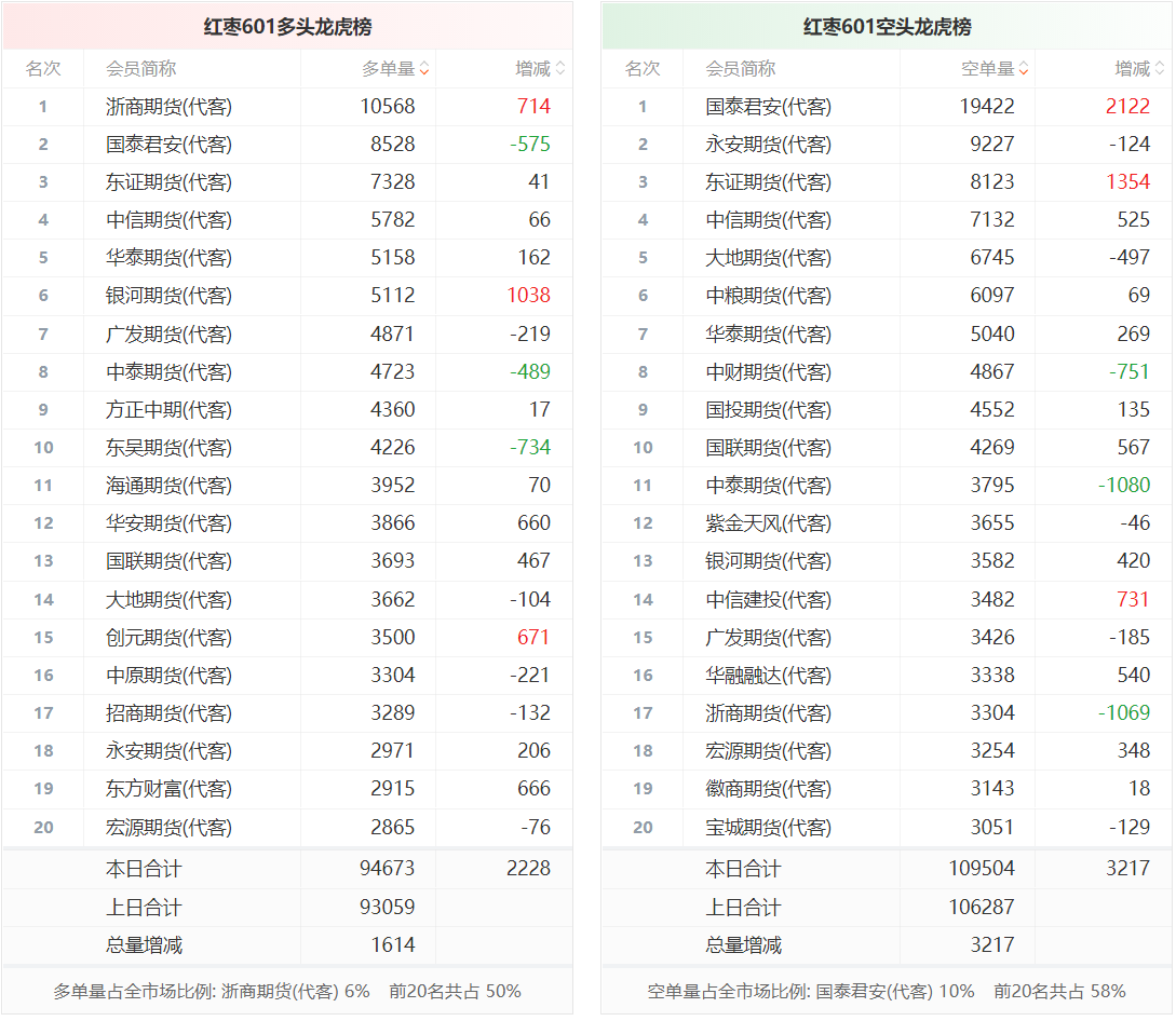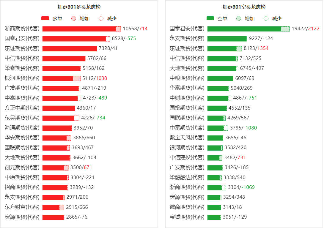总体而言,红枣601合约今日增仓下行,多空持仓排名前20席中,多空双方均呈进场态势,多头进场意愿弱于空头。