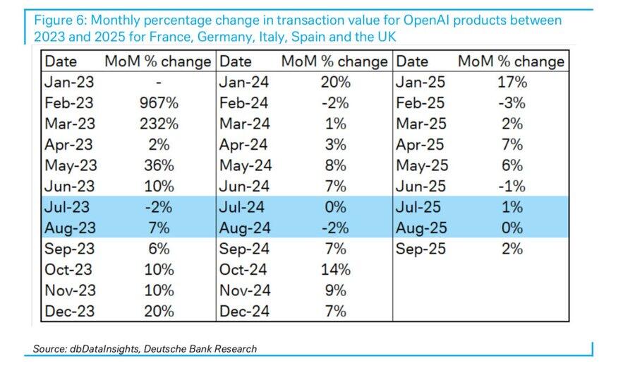 根据德意志银行dbDataInsights团队对法国、德国、意大利、西班牙和英国五大欧洲市场的追踪数据天牛宝配资,ChatGPT的消费支出月度增长率自2025年5月起明显放缓。